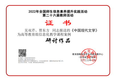 近日,教育部教育技术与资源发展中心颁发了“2022 年全国师生信息素养提升实践活动(第二十六届教师活动)”的荣誉证书。PA集团官方网站报送的本科生课程《中国现代文学》获得高等教育信息化教学课程“研讨作品”称号。